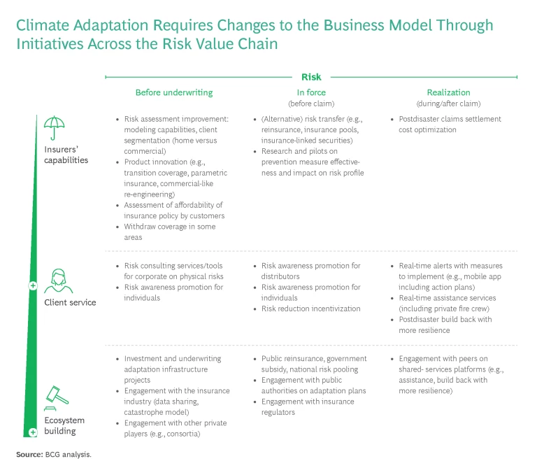 - Insurers’ Capabilities: Improving Risk Management. Implement internal measures to better assess and price risk while limiting exposure (including risk transfer and, where necessary, coverage withdrawal). Specific initiatives include improved risk assessment (with stochastic forward-looking models, for example), product innovation, risk transfer, and postdisaster claims settlement optimization.