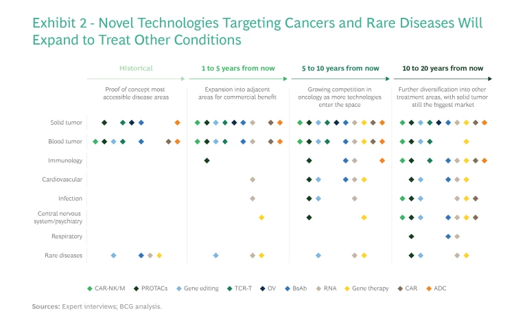 Other drug pipelines are aiming beyond oncology and rare diseases to conditions that can be treated through similar mechanisms of action—expanding, for example, from immuno-oncology to immunological disorders, or from rare neurological disorders such as AADC deficiency to more common neurological diseases like Parkinson’s disease. In the longer term, most of these modalities will be used to treat a broader array of diseases, including metabolic, neurological, infectious, and respiratory diseases. (See Exhibit 2.) This is evidenced by the increasing number of preclinical and early-stage pipelines targeting indications other than cancer and rare diseases.