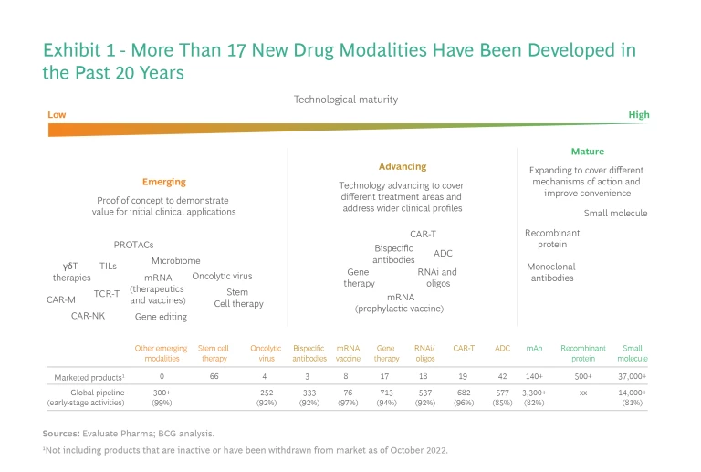 We group new drug modalities into three categories according to their maturity, as reflected in their technological advancement, clinical application, and commercial readiness. Over the past 20 years, more than 17 new modalities have been developed spanning all three categories. (See Exhibit 1.)