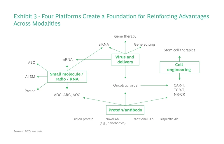 Success with new modalities requires not only specific R&D domain knowledge but also experience in regulatory, manufacturing, supply chain management, and commercialization issues, which can take years to develop. Yet once a company has developed those capabilities for one modality, it can apply them to other, related modalities. For that reason, a platform approach can help companies target multiple modalities and generate synergies across them. There are four such development platforms, each with its own specific requirements. (See Exhibit 3.)