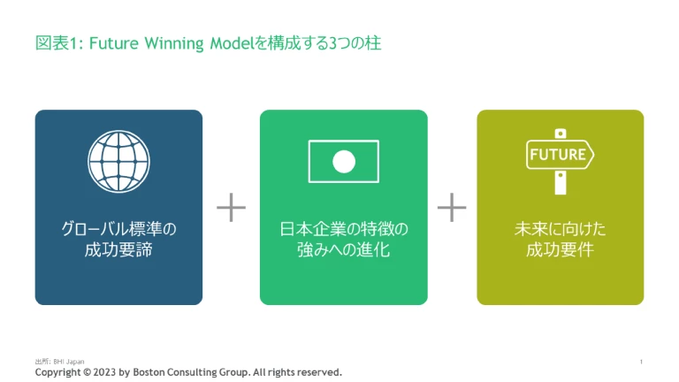 Future Winning Modelは、「グローバル標準の成功要諦」「日本企業の特徴の強みへの進化」「未来に向けた成功要件」の3つの柱から成ります(図表1)。