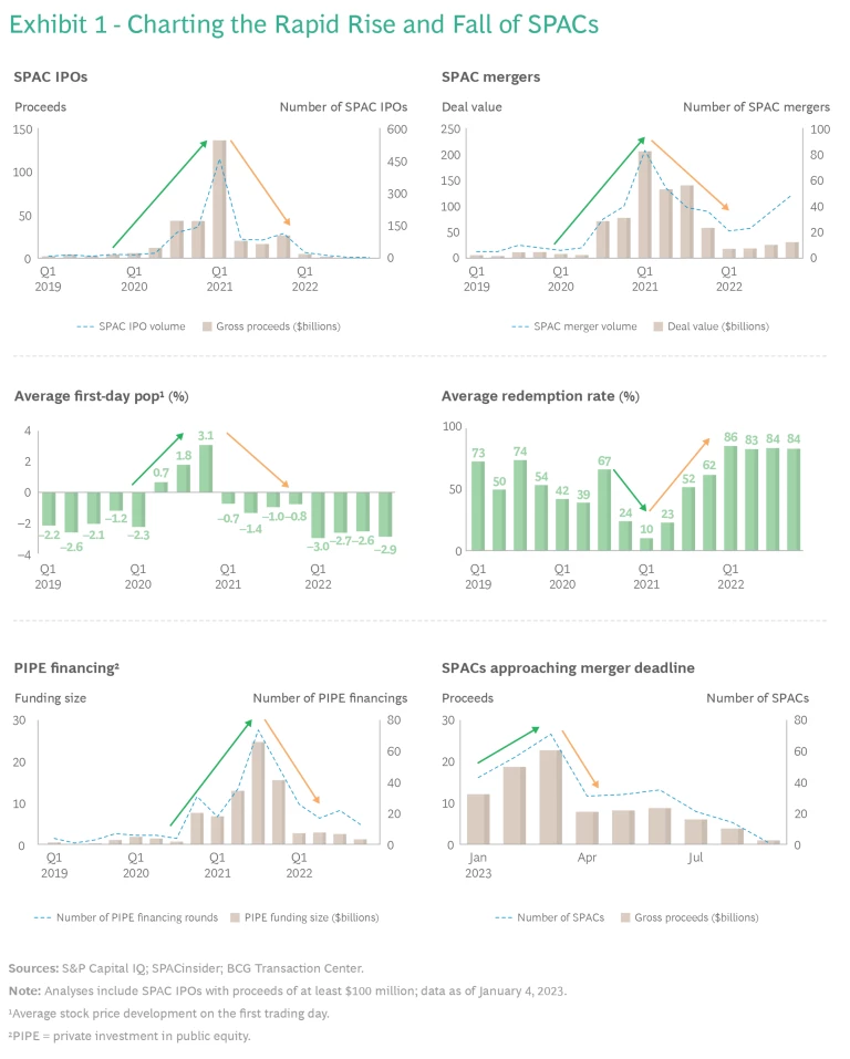 SPACs experienced a phenomenal rise and fall in 2020 and early 2021. The frenzy fizzled out because of intensified regulatory scrutiny and changing market dynamics. However, many SPACs launched during the boom are still looking for targets to merge with. At the end of 2022, approximately 350 SPACs (with $96 billion in raised proceeds) faced a 2023 deadline to acquire a target—and most of them must make a deal during the first quarter.