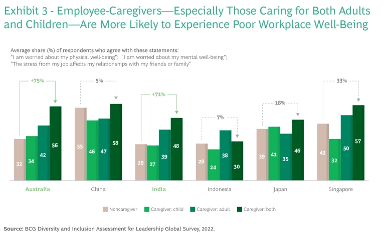 - The employee-caregivers in our survey already report lower feelings of well-being: in some countries, they are 70+% more likely than employees who are not caregivers to say that they are worried about their physical and mental well-being, for instance.