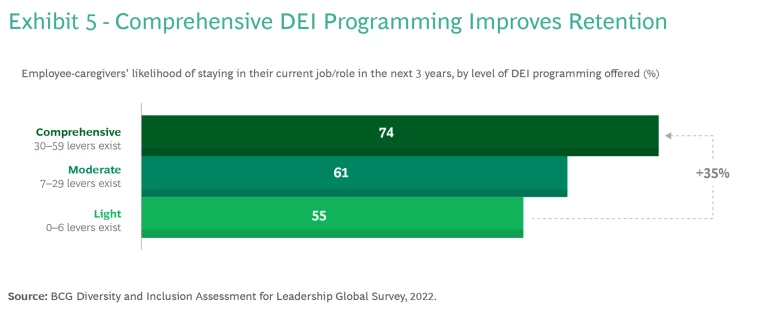 Holistic programs with comprehensive investment in 30 or more DEI initiatives resulted in a 20-percentage-point increase in retention of employees who are caregivers versus those who are not. Employee-caregivers’ anticipated retention was 8 percentage points higher than that of noncaregivers at companies with comprehensive policies and programs.