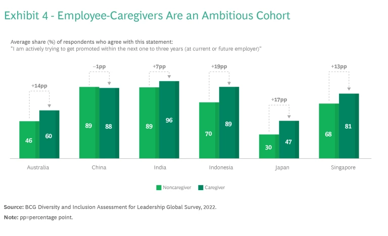 Dual caregivers are the most ambitious. In fact, in Australia and Japan they are approximately twice as likely as those who are not caregivers to seek promotion within three years.