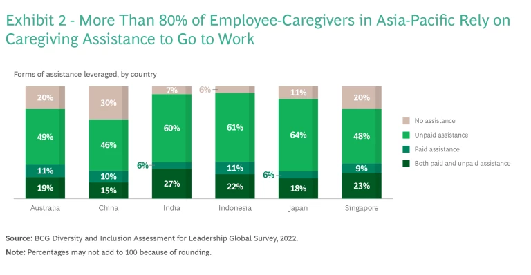 Most employee-caregivers require assistance. More than 80% of employee-caregivers rely on care assistance to be able to attend to their paying job. The levels and forms of assistance vary across countries. Across the Asia-Pacific countries surveyed, respondents predominantly leveraged unpaid-care assistance or a combination of paid- and unpaid-care assistance in order to carry out the responsibilities of their paying job. (See Exhibit 2.)