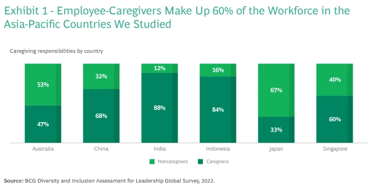 Employee-caregivers make up the majority of the workforce. Most employees in Asia-Pacific identify as caregivers. (See Exhibit 1.)