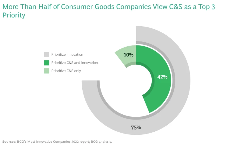 Many CPG companies want to go green. According to BCG’s 2022 Most Innovative Companies (MIC) report, 52% say that sustainability is a top-three priority. (See the exhibit.)