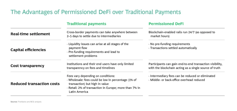 While these limitations slow down payments, a permissioned DeFi model for cross-border transactions is much faster and more transparent. (See the exhibit.)