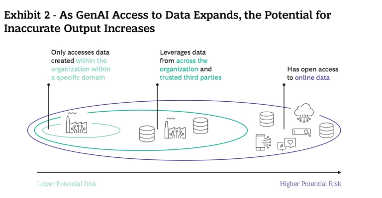 Although well-designed workflows are certainly possible, the unpredictable nature of GenAI is causing some organizations to hesitate in rolling out GenAI tools across the enterprise. As noted, for example, GenAI tools can give answers that vary by user and even by interaction. Moreover, this variability increases as the tools gain access to larger datasets outside the organization’s control. This increases the risks of misinformation and inaccurate responses. (See Exhibit 2.)