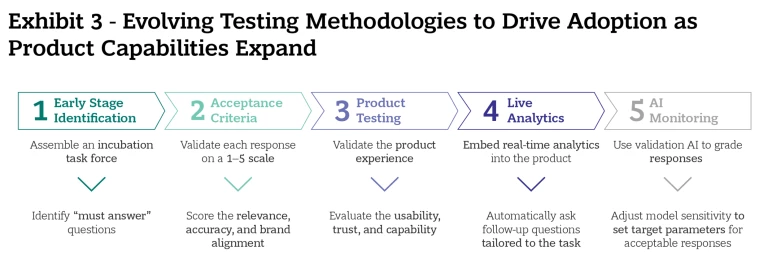 5. AI Monitoring The final phase of the testing methodology is continuous monitoring and improvement to de-risk responses at an enterprise scale. To this end, companies can deploy other GenAI tools that act as synthetic users, grading the responses of the product using the acceptance and product testing criteria. This monitoring helps organizations assess if changes are needed to the data used to train the underlying model, thus adding an extra layer of quality control alongside user testing. Companies can also adjust the sensitivity of multiple validation models to set boundaries for highly acceptable and highly unacceptable responses. These findings can then be fed back into the product to refine its future responses and ensure a process of continuous improvement.