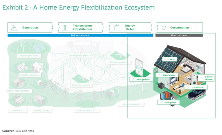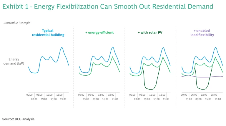 Many countries are addressing this already. Germany has set a goal to increase the share of electricity consumption from renewable sources to 80% by 2030 from about 50% now. Renewable energy generation relies heavily on weather conditions, while energy demand from consumers and industries follows predictable usage patterns. By adopting flexible energy strategies in residential buildings, supply fluctuations can be mitigated, making the use of renewables more viable and contributing to the overall stabilization of the grid (see Exhibit 1).