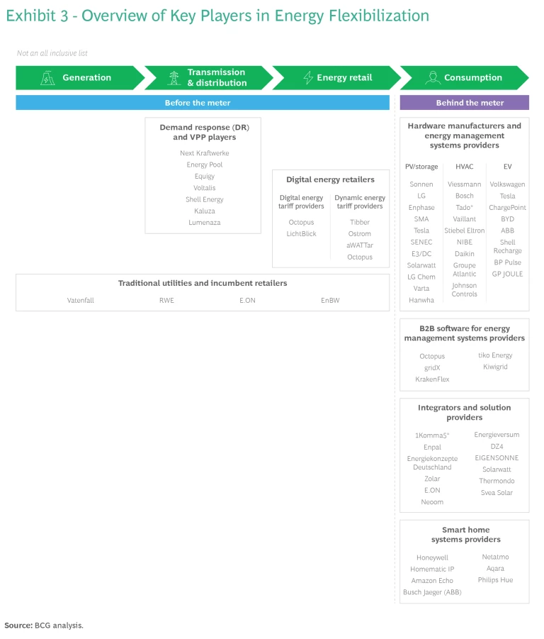 Residential energy flexibilization is a new paradigm in how consumers and businesses view electricity supply and demand—and their own roles in decarbonization. The market is fresh and we think it will develop rapidly in certain segments. Companies must seize the opportunity. In order to map the landscape and areas of opportunity, we have separated the key players in the market into the most prominent categories of flexible residential energy (see Exhibit 3).