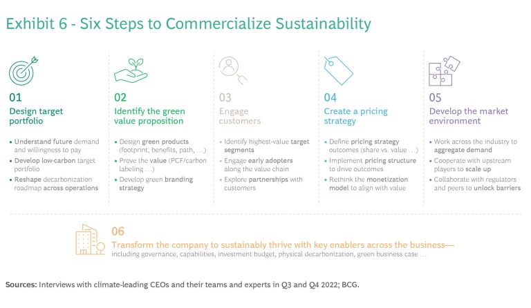 BCG and the World Economic Forum have set out a green go-to-market roadmap for commercializing sustainability. (See Exhibit 6.) It has six steps: