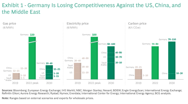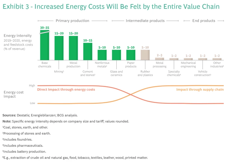 If the scenarios are right, the resulting energy price disadvantage will fundamentally alter the competitiveness of multiple major European industries. The impact will be felt along the entire value chain, from process industries to end products, either directly or indirectly. (See Exhibit 3.)