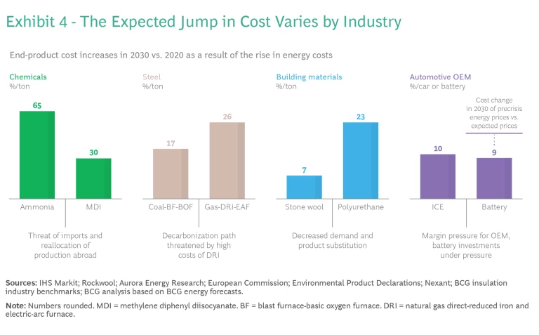 - Automotive. Across the value chain, higher energy costs are expected to raise the price of a typical internal combustion engine (ICE) C-segment car by about €1,500 in 2030 over 2020. Many suppliers will struggle to compensate for high energy costs through cost reduction and efficiency measures alone. Since they also face other challenges, such as the availability of skilled labor, it is likely that some companies will shift production toward less expensive countries.