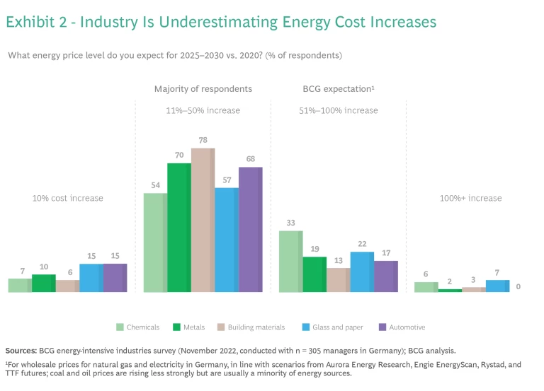Industry, at least in Germany, appears to be underestimating the impact. While various energy and commodity scenarios point to an uplift of 50% to 100% in natural gas prices in 2030 (to €20 to €40/MWh), roughly one-half to three-quarters of our survey respondents expect increases of only 11% to 50%. (See Exhibit 2 and “The Outlook for Natural Gas in Europe.”) Furthermore, only 36% have started to implement forward-looking measures as a response to the energy crisis.