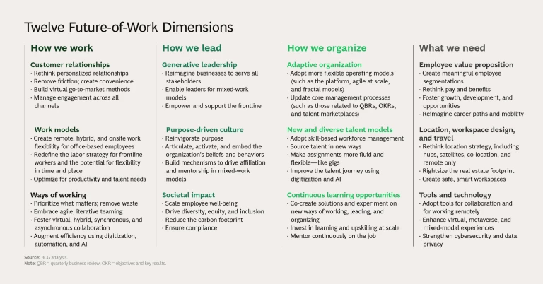 The survey covered 12 future-of-work dimensions across four categories. (See the exhibit.)