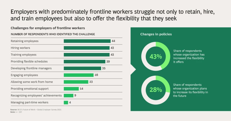 - Finding and retaining enough workers are the greatest challenges for employers with a predominantly frontline workforce. About 40% of these organizations have increased the flexibility they offer frontline workers, and another 28% plan to do so in the coming year. The vast majority (79%) also say that improving frontline-manager development is a top priority in the short term.