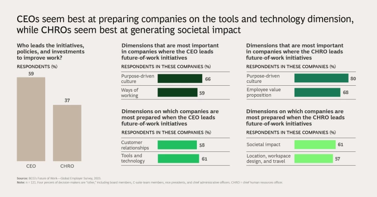 Get the CEO to lead from the front. Survey respondents noted that when CEOs lead work initiatives, they tend to focus on activities that they see as setting up their organization for the future. All too often, they leave important people-related topics to their CHROs to resolve—without offering much engagement or support. CHROs could use the survey findings to convince the CEO and the rest of the leadership team to engage, invest, and drive the effort to build a better workplace.