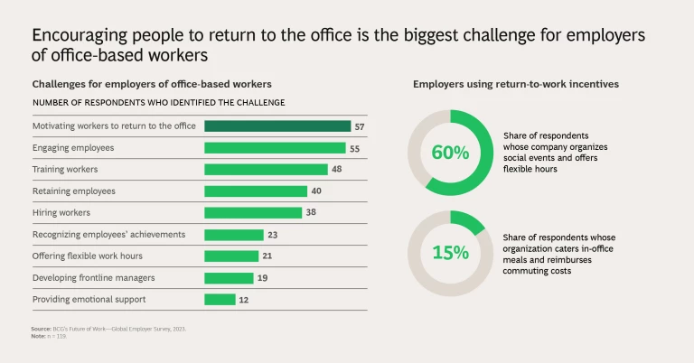 - Encouraging employees to return to the office is the biggest challenge for organizations with mostly office-based workers. These businesses are using social events, flexible hours, and perks such as free food and drinks to entice people to come back.