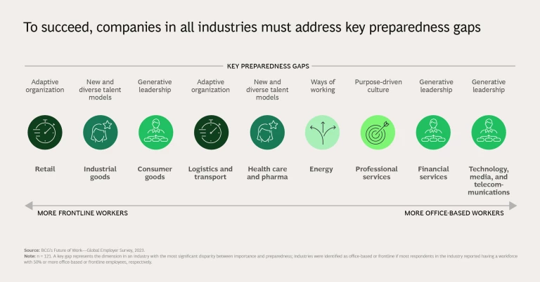- Companies with predominately frontline workers aren’t meeting their goals to become adaptive organizations or to implement new and diverse talent models.