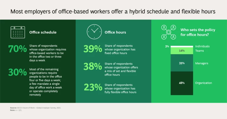 Nearly all companies that are pushing for a greater presence in the workplace recognize the value of maintaining some level of flexibility. But the bigger issue is creating an environment that increases productivity and even sparks joy. “We do not motivate colleagues to come back to the office,” one executive told us. “We encourage teams to identify the way to collaborate that best fits their team.”