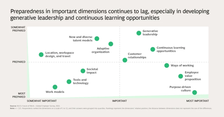 Two findings, in particular, stand out. Employers are not as prepared as they want to be in developing generative leaders—the type of leaders who inspire employees and create an environment in which they can do their best work. And they are failing to provide continuous learning opportunities—those that incorporate upskilling and reskilling into employees’ work every day.