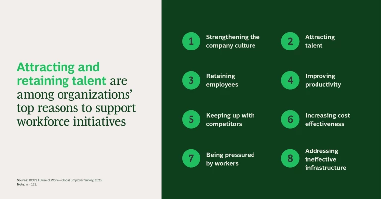 - Attracting and retaining employees are among the top motivators for organizations of all types to support workplace initiatives. Leaders consider these reasons even more important than improving productivity, keeping up with competitors, and increasing cost effectiveness.