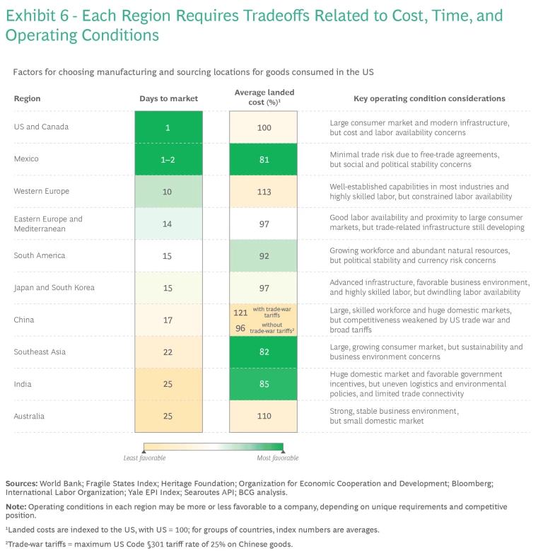 Instead, each country has its own advantages and disadvantages. (See Exhibit 6.) Consequently, when designing their production footprints, manufacturers must make tradeoffs that best serve their strategic priorities.