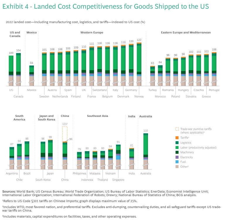 We have updated the BCG Global Manufacturing Cost Competitiveness Index, which benchmarks costs in 38 leading export manufacturing nations against those of the US, to reflect the cost of manufacturing a product and bringing it from the factory to its end market. (See Exhibit 4.) In addition to accounting for productivity-adjusted labor costs and energy prices, we have included transportation costs to the US, machinery depreciation, and tariffs. For goods imported into the US from China, the cost-competitiveness index also factors in the costs of trade-war tariffs imposed by the US on Chinese-made products.