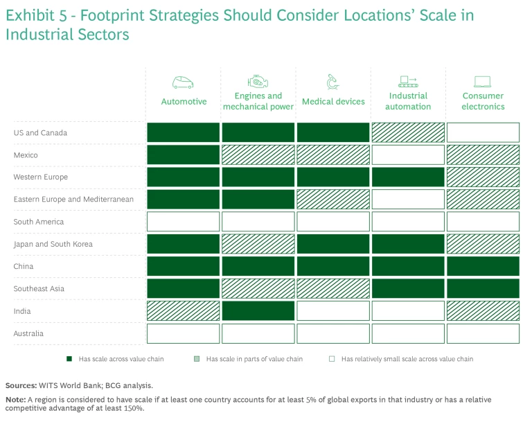 When companies take all five recommended actions into account, no country emerges as the best option for landed cost and time to market and operating environment. Nor does every target country have sufficient production scale in the desired industry. (See Exhibit 5.)
