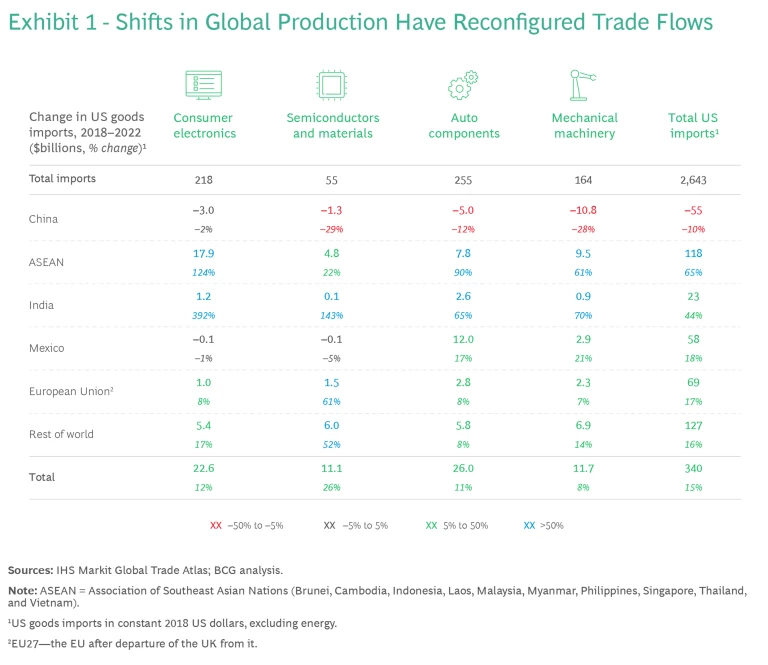For example, US imports of mechanical machinery from China shrank by 28% from 2018 through 2022, but increased by 21% from Mexico, 61% from ASEAN, and 70% from India (albeit from a low base). US imports from China did increase slightly in a few sectors, however, such as biopharmaceutical products and chemicals. The main drivers of these shifts were supply-chain and geopolitical pressures. (See Exhibit 2.)