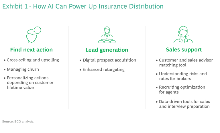 The technology can optimize a wide variety of processes in distribution. But we see particular success in three areas: helping agents find their next-best action, lead generation, and general sales support. (See Exhibit 1.)