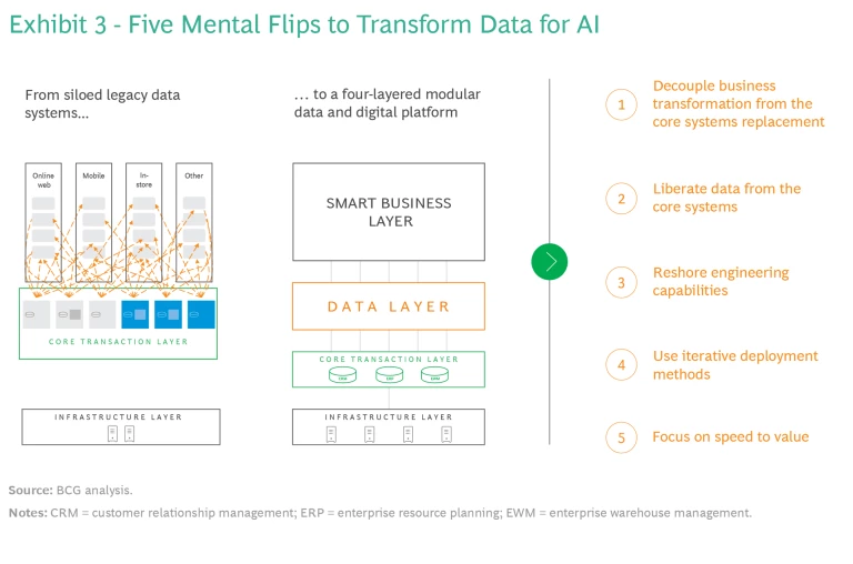 The solution is a layer that decouples front and back systems, liberating data from the core transactional systems. (See Exhibit 3.) These new digital foundations should be built using a modular, cloud-based architecture.
