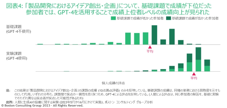 これまでに述べてきた集団レベルで見られる影響は、必ずしも生成AIが個人に与える影響を示しているわけではない。平均値ではなく個々の成績を見てみると、GPT-4の使用は個人の成績分布に異なる2つの影響を与えることがわかる(図表4)。第一に、分布全体が右(より高い成績)へシフトしている。これは、前述した約40%もの成績向上が、「ポジティブな外れ値」(標準よりも大幅に高い成績を出した人)のせいではないことをはっきりと示唆している。製品開発におけるアイデア創出・企画の課題にGPT-4を使用した場合、基本的習熟度に関係なく、ほぼすべての参加者(約90%)がより質の高い解答を出した。第二に、成績のばらつきが劇的に減少した。平均的な成績を収めた参加者の割合が、GPT-4を使用した場合の方が高かった。