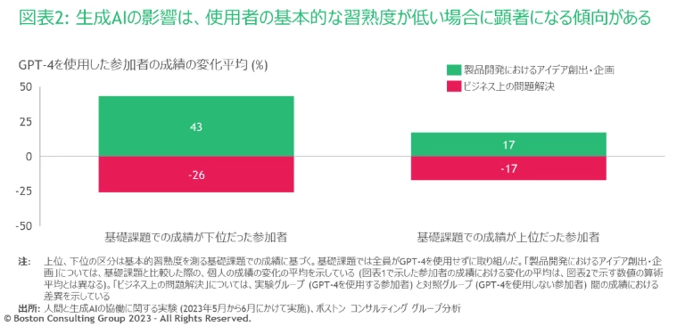 この“もろ刃の剣”的効果は、基本的習熟度の高低にかかわらず当てはまる(実験開始時に、参加者はGPT-4を使用せずに基礎課題を解き、私たちが採点して順位をつけた。詳細は「実験の設計と手法について」をご参照ください)。注目すべき点として、基本的習熟度が低ければ低いほど、その効果は顕著になる傾向があった。製品開発におけるアイデア創出・企画の課題では、基本的習熟度の低い参加者の成績が43%向上した。同様に、この効果は基本的習熟度が上位だった参加者にとっても重要な影響があり、2つの課題(「製品開発におけるアイデア創出・企画」と「ビジネス上の問題解決」)でGPT-4を使用した場合、前者では基礎課題の成績から17%向上。後者では対照グループの成績より17%低かった(図表2)。ただし実験全体を通して、参加者の成績に関する議論は、用意した課題をはじめ他の業務に関する参加者の能力や才能の絶対的水準を示すものではない。