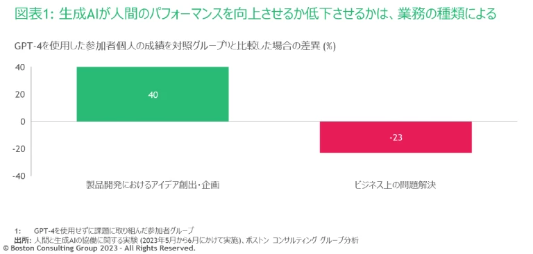 この結果は、生成AIの導入が“もろ刃の剣”であることを明らかにしている。実験では、製品開発におけるアイデア創出・企画でGPT-4を使用した参加者の成績が、対照グループ(GPT-4を使用せずに課題に取り組んだ参加者グループ)を40%上回った。しかし、ビジネス上の問題解決では、GPT-4を使用した参加者は対照グループよりも23%低い成績にとどまった(図表1)。