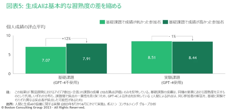 言い換えれば、基本的習熟度の低い参加者が生成AIを使用した場合、習熟度の高い参加者とほぼ同じ結果になったということである。製品開発におけるアイデア創出・企画の業務で誰もがGPT-4を使えば、テクノロジーの助けなしに能力の高い人であっても、それほど優位には立てない(図表5)。高学歴で成績優秀な実験参加者の間でこの影響が観察されたということは、より習熟度に幅があって不均質な状況では、この影響がさらに顕著になる可能性がある。