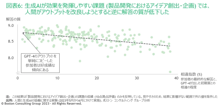 さらに掘り下げると、GPT-4は製品開発におけるアイデア創出・企画の業務において非常に高いレベルに達しているため、平均的な人間がGPT-4のアウトプットを改善する余地はないようだ。実際に、GPT-4の出力を改良しようとすると、最終的に人間が出す解答の質は低下する(質の評価については「実験の設計と手法について」をご参照ください)。私たちは、GPT-4のアウトプットを「コピー&ペースト」することが、成績と強く相関していると気づいた。製品開発におけるアイデア創出・企画の課題において、参加者の最終的な解答がGPT-4の初期案から離れれば離れるほど、解答の質が低下する可能性が高くなる(図表6)。GPT-4の初期案からの相違指数が10%高くなるごとに、解答の評点順位は平均で約17%低下した。