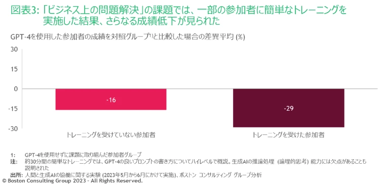 しかし、今回の結果はそう単純ではない。参加者にGPT-4のプロンプト(生成AIに入力する質問・指示)の書き方とこのテクノロジーの限界について説明した場合でも、ビジネス上の問題解決の課題でGPT-4が及ぼす悪影響は解消されなかった(「実施したトレーニングについて」をご参照ください)。