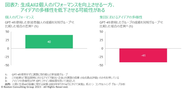 1つ目のリスクは、「個人のパフォーマンス向上」と「集団の創造性低下」のトレードオフである。GPT-4は、同じ種類のプロンプトに対して何度も似たような回答を出力する。そのため、GPT-4を使用した参加者が提出した解答は、個々人で見れば優れていたが、集団で見ると同じような内容になっていた。製品開発におけるアイデア創出・企画の課題でGPT-4を使用した参加者のアイデアの多様性は、使用しなかったグループと比較すると41%低かった(図表7)。GPT-4のアウトプットを編集した場合でも、個性はさほど出せなかった。