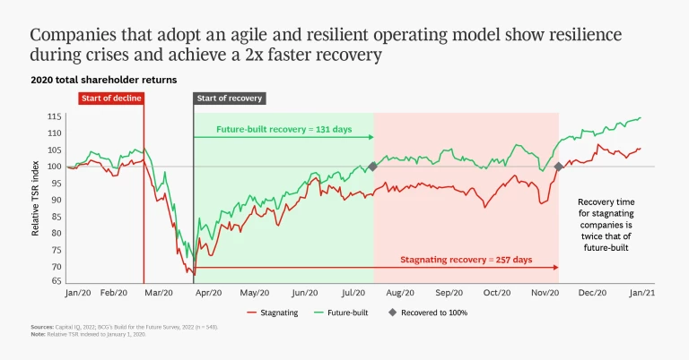 The benefits of an agile and resilient operating model include recovery from crises more than two times faster than that of stagnating companies. (See exhibit.)