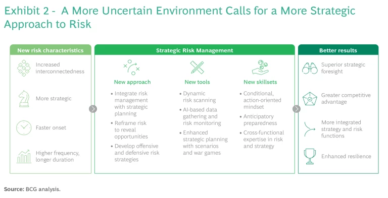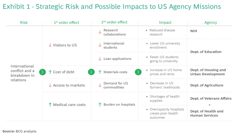 The EPA is perhaps an extreme example, but it’s not alone. The challenge is growing. As Exhibit 1 shows, public-sector entities are exposed to a range of increased geopolitical risk. Many public sector agencies apply a largely defensive, siloed, inward-looking, compliance-based approach to risk management, ignoring the broader strategic risks that could prevent them from achieving their stated strategic objectives. This is in direct contrast with the risk management mindset and approach of leading private sector organizations. BCG research across ten large multinational corporations found that companies are increasingly preparing for strategic disruptions like geopolitical risks through proactive risk management to enable strategic resilience—and even create new advantages by embracing the appropriate level of risk.