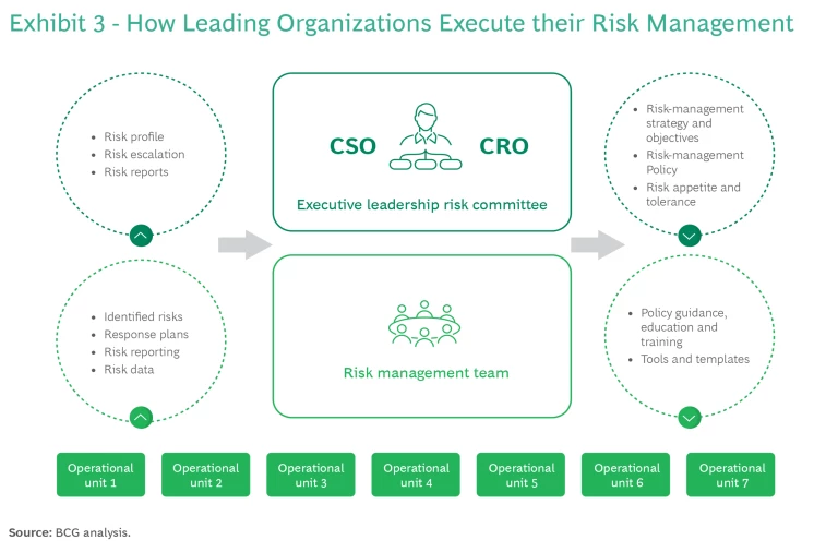 The most strategic-risk-intelligent organizations, however, enable these existing risk centers to assume a more anticipatory, strategic, and active role. CROs sit at the same level as chief strategy officers (CSOs), and their teams serve as thought partners to offices, remain current on the latest developments to provide offices with new risks for consideration, and disseminate ideas and best practices. The CROs also serve as facilitators of discussion that brings together the risk representatives from across all the offices, essentially bringing a risk lens to strategy development and a strategy lens to risk management. (See Exhibit 3.)
