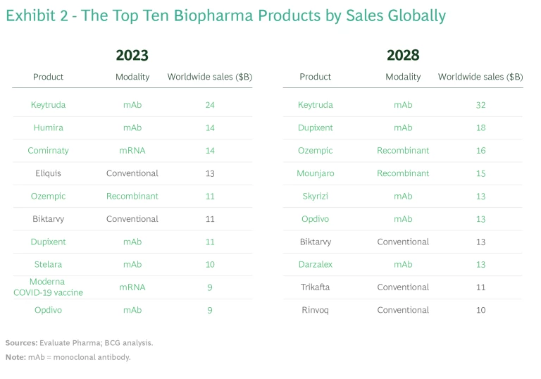 We expect that new modalities will continue to be a big driver of revenue growth. In 2023, four of the six top-selling biopharma products are based on new modalities—in 2028, that will be true of all top six products. (See Exhibit 2.)