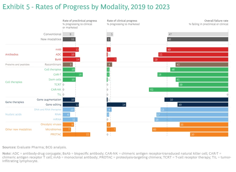 On average, new modalities have progressed slightly faster than conventional assets in earlier phases of development, but a smaller portion of new-modality clinical assets has reached the market. Among the new-modality agents, mAbs, BsAbs, and CAR-T therapies have seen higher than average rates of progress, particularly at the preclinical stage.