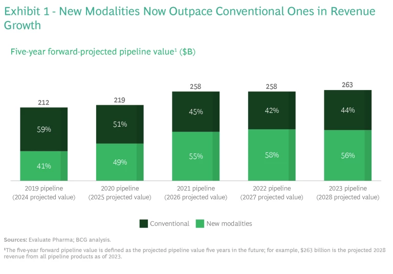 And the promise is already becoming a reality, as the enormous success of the COVID-19 mRNA-based vaccines has demonstrated. Notably, 2021 was the first year that new modalities, rather than conventional small molecules, were responsible for more than half of future projected biopharma revenues. (See Exhibit 1.) According to our analysis, over the past few years, revenues from new-modality products increased by $60 billion, while revenues from conventional products declined by $10 billion.