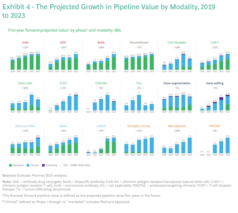 Some technologies that were leaders in 2019 have experienced slower growth in forecasted revenue. For example, gene therapy, the third-largest category in 2019 after mAbs and recombinants, has increased by only $3 billion and its projected value has now been surpassed by ADCs and mRNA.