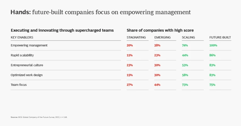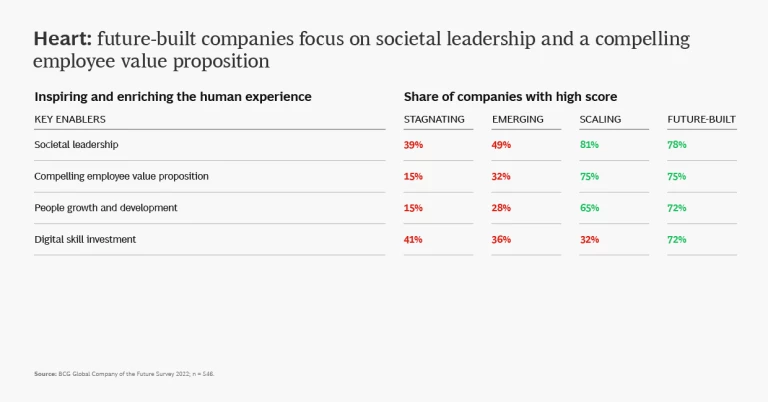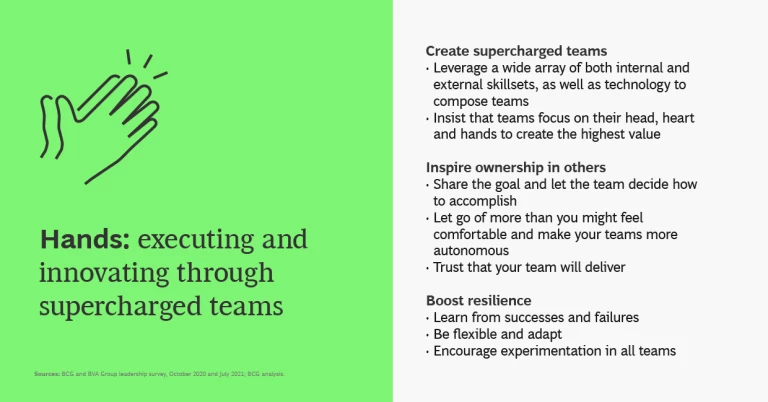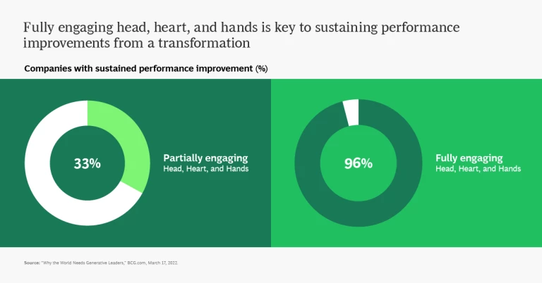 Leaders of future-built companies are generative across the head, heart, and hands—as one team. The head refers to reinventing business to serve people, planet, society, and shareholders; the heart involves inspiring and enriching the human experience; and the hands entails executing and innovating through supercharged teams. Among companies that fully engage the head, heart, and hands, 96% see a sustained performance improvement, compared with just 33% that partially engage.